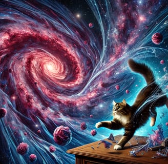 O universo segue leis rigorosas da física, mas ao mesmo tempo pode parecer caótico, com buracos negros devorando estrelas e galáxias colidindo. Os gatos são mestres nessa dualidade: um minuto eles estão dormindo tranquilamente, no outro estão derrubando tudo nos seus picos de energia como se fossem agentes do caos 😂.